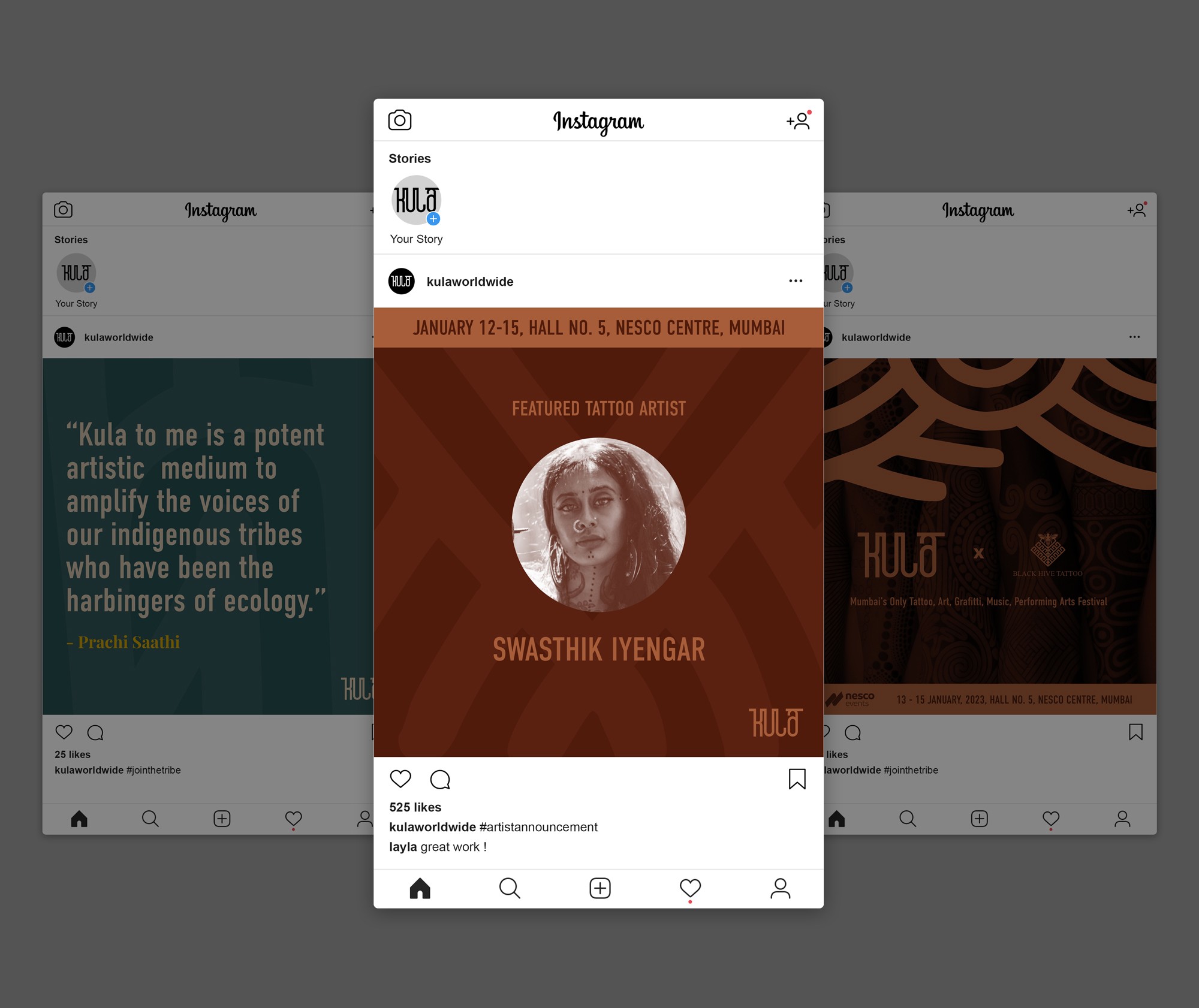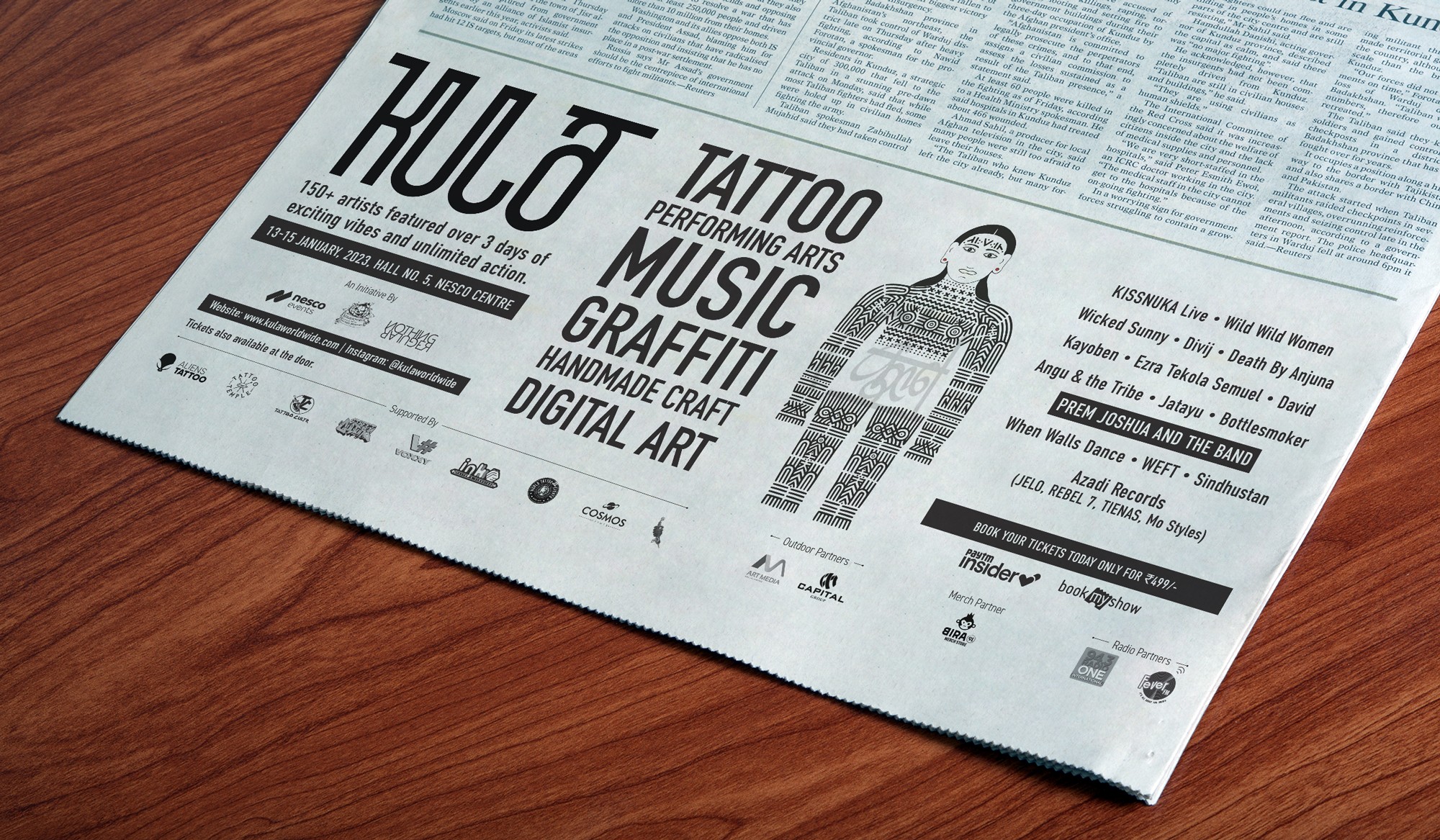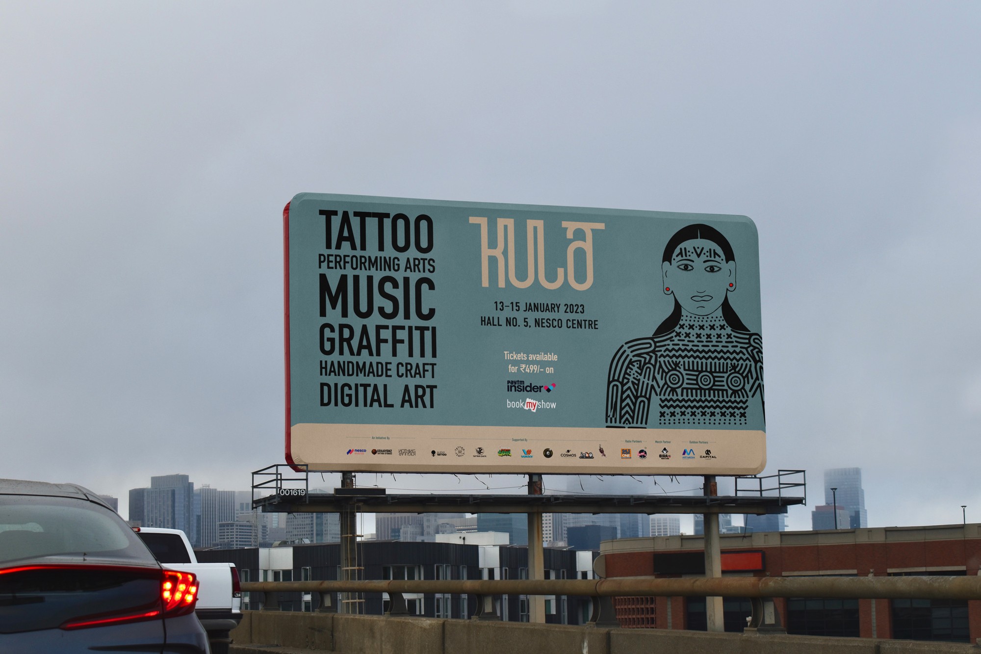 KULA, an annual event, aimed to create a cohesive and vibrant identity that resonated with a diverse audience interested in arts and music, including tattoo artists and enthusiasts, graffiti artists, performers, music lovers, beatboxers, rappers, and people from all walks of life. The event focused on promoting culture, indigenous arts, and music, with a special emphasis on indigenous tattoo art. One of the main objectives is to highlight different indigenous tattoo artists and their art every year. The inaugural year featured Baiga art by Mangla Bai from Madhya Pradesh, India. The primary goal was to craft a homogenous look and feel for the event while ensuring that its unique personality, inspired by Mangla Bai’s Baiga art, shines through every touchpoint.