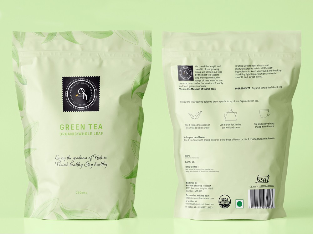 The Organic Green Tea packaging design is framed with illustrations of the green tea leaves with shades of green to evoke a sense of freshness and lightness.