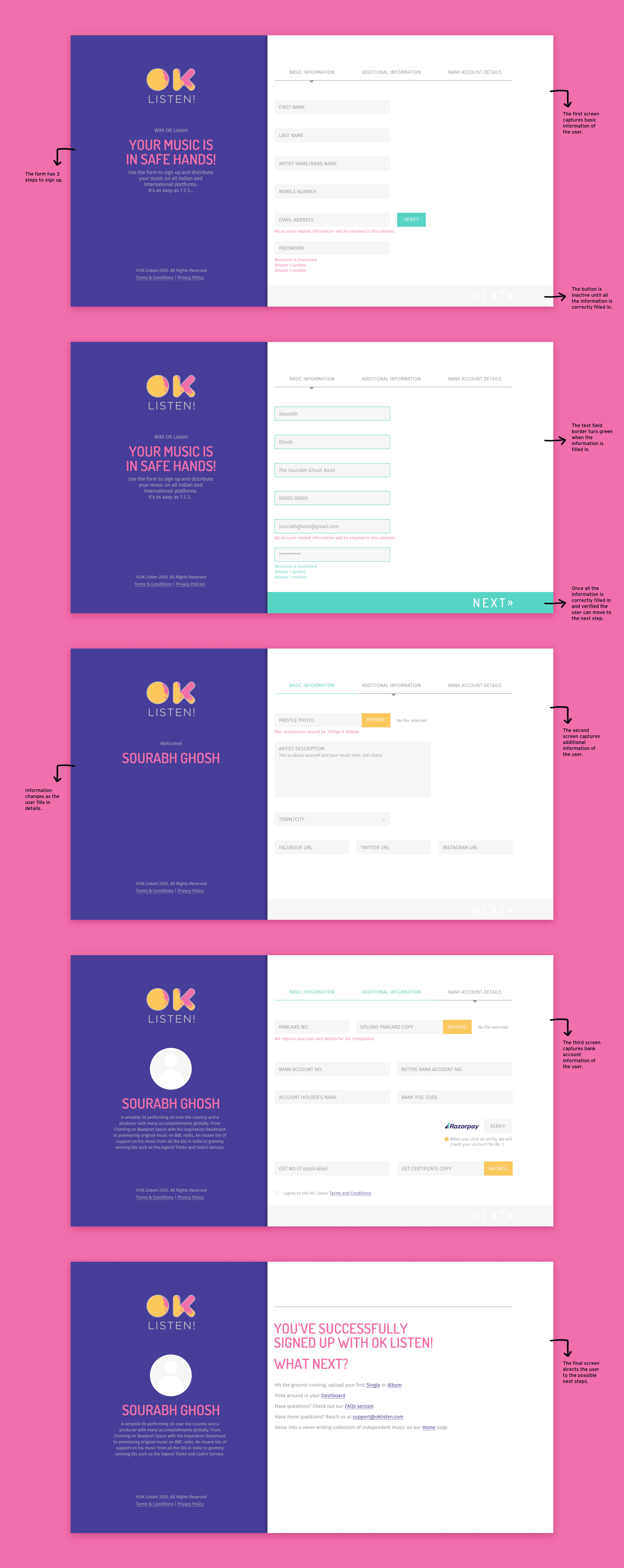 The sign-up module design is minimalistic and intuitive for the user in which one half of the screen comprises of the form fields that get highlighted as the information is filled in and the other half is updated and personalised with the artist’s information. The copy written especially for the OK Listen! platform is youthful and spirited in nature and enhances the intuitive experience for the interface.