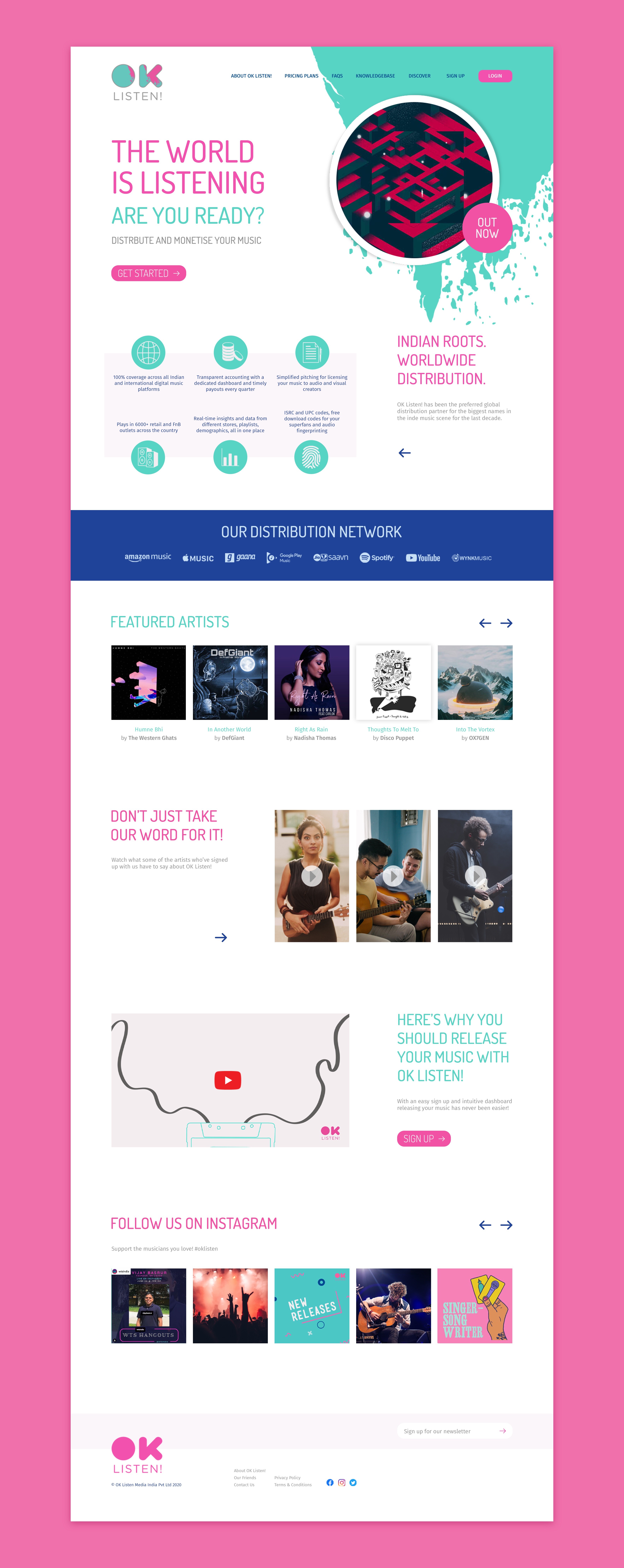 The website needed to cater to both musicians and listeners, therefore it was crucial for the website to be instinctive and familiar. The home page showcases the new releases and features artists for the week. The other pages includes a Pricing Plans’ page which has information for artists on how to release their music, the FAQs page which helps with questions artists might have before they are ready to release their music, and the Discovery page is where the listeners may discover new and established artists and their releases. The bold colour palette and the overall design of the website are a reflection of the contemporary independent music scene in India, and OK Listen! The cheeky copy is written to further add to the intuitive and spirited quality of the brand that lends it a friendly and familiar vibe.