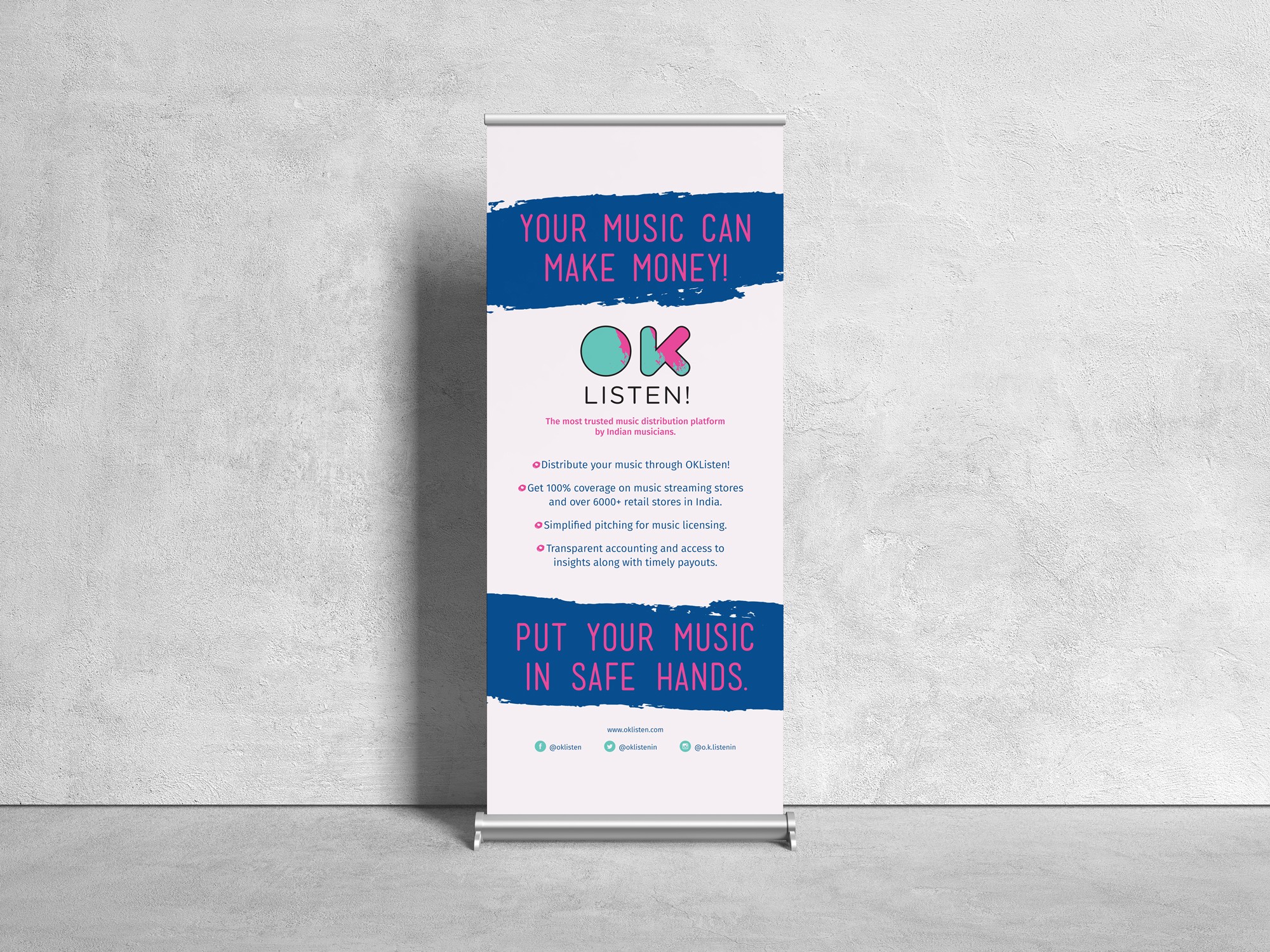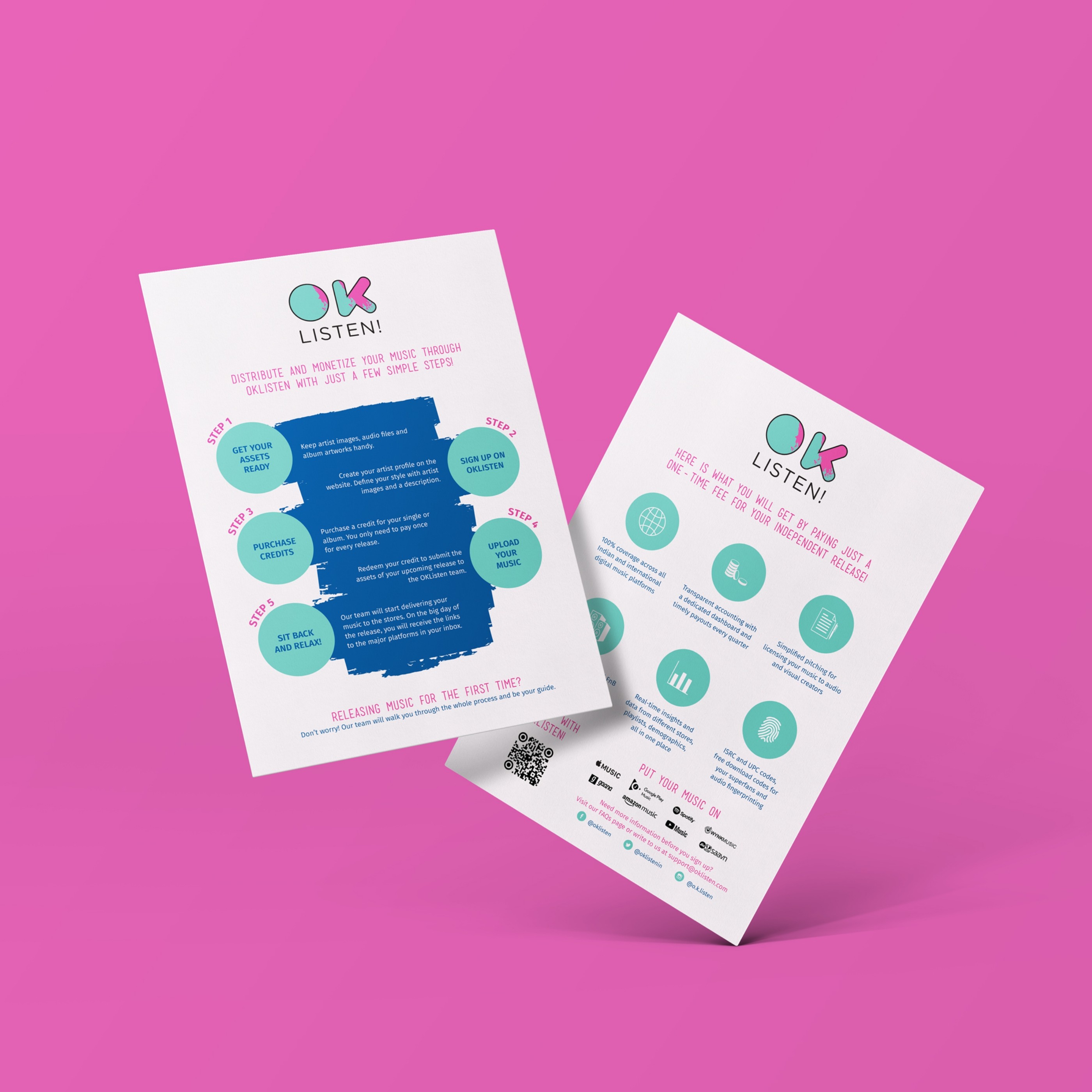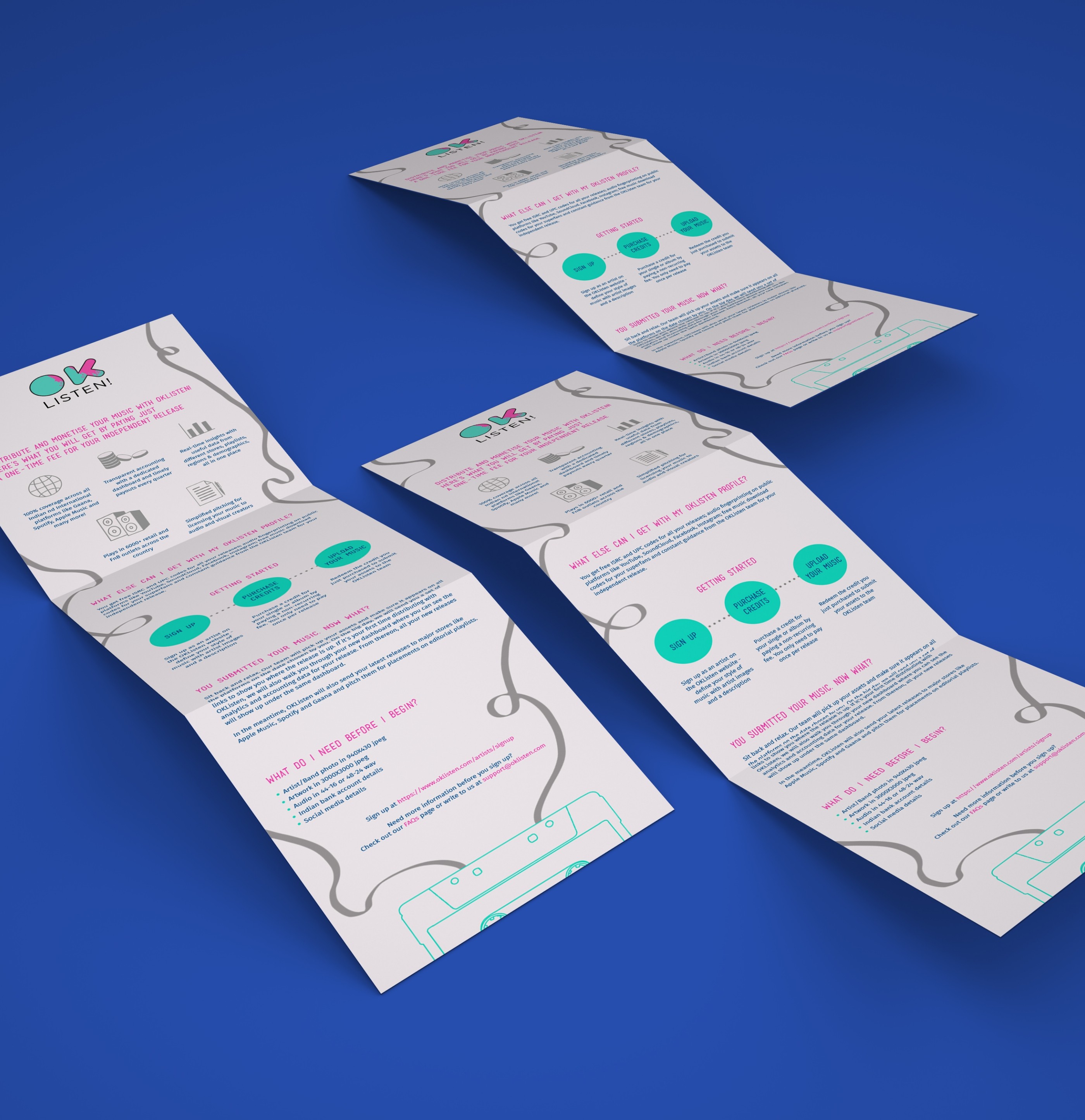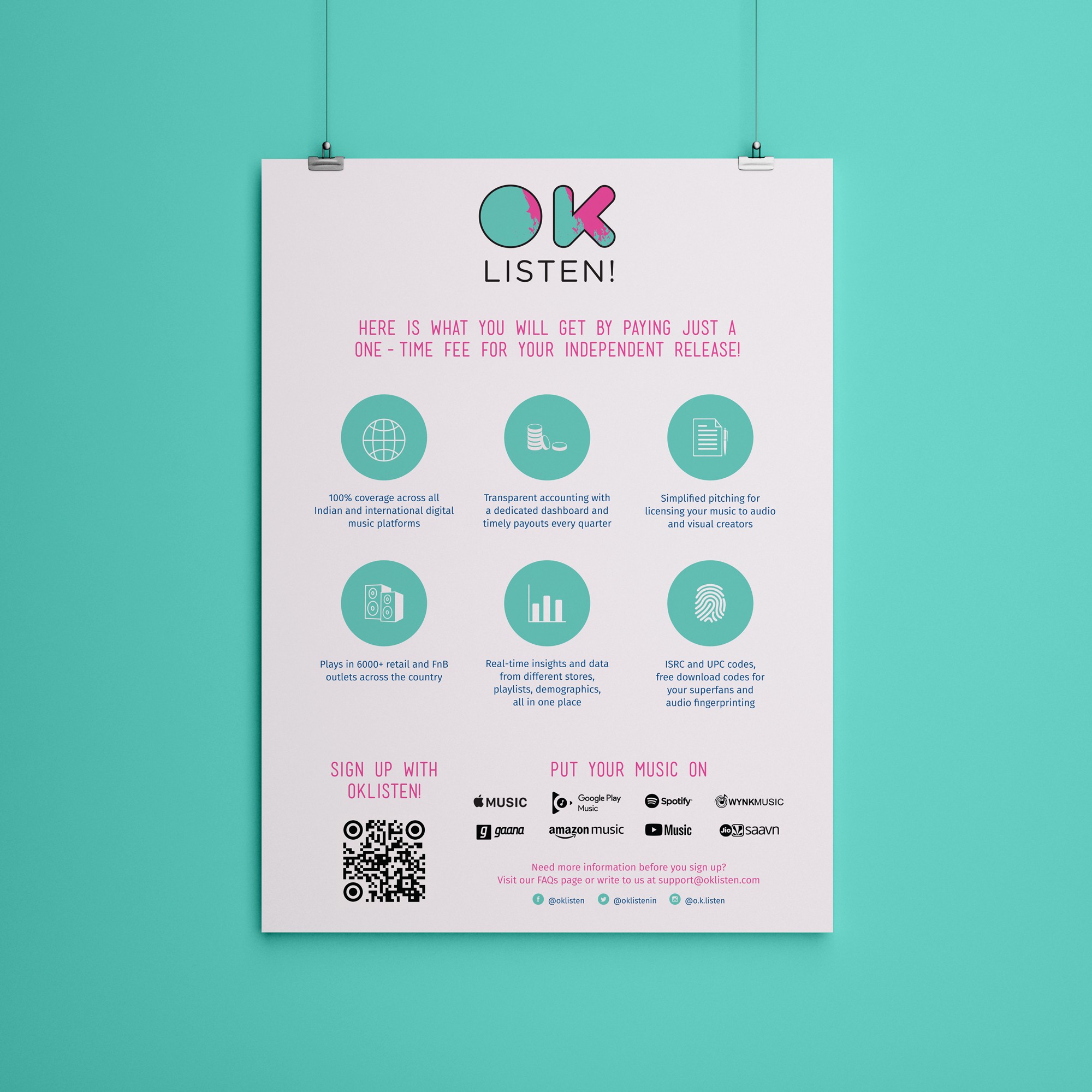 OK Listen! needed to demonstrate their effortless sign up process. We designed a simple infographic explaining step by step how easy it is for musicians to sign up on the OK Listen! website. The infographic design was also translated onto posters, flyers and standees for events. Along with these marketing assets we also designed social media posts and Tshirts for the brand to distribute at music festivals.